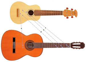 The uke belongs to the lute family of instruments, and its 4 strings are generally tuned like the 3rd (G), 2nd (C instead of B), and 1st strings of the guitar (E) + a top A string. So one can look at it as an 8 string guitar where the lower 4 strings (G is 8th, C is 7th, E is 6th, A is 5th string) become the only 4 of the ukelele, but at a higher pitch. The image to the left shows where a ukelele’s open strings can be found on a guitar.